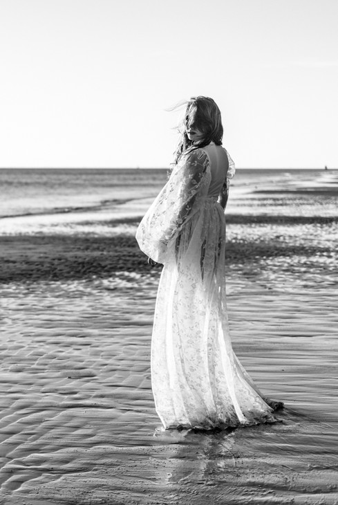 Kaya had een tas vol kleding meegenomen. In de duinen maakten we wat eerste mooie beelden, daarna liepen we naar het strand. Hier trok Kaya een prachtige zelfgemaakt witte jurk aan. Het was een lichte stof waar de zon prachtig doorheen scheen. Dit leverde prachtige plaatjes op.